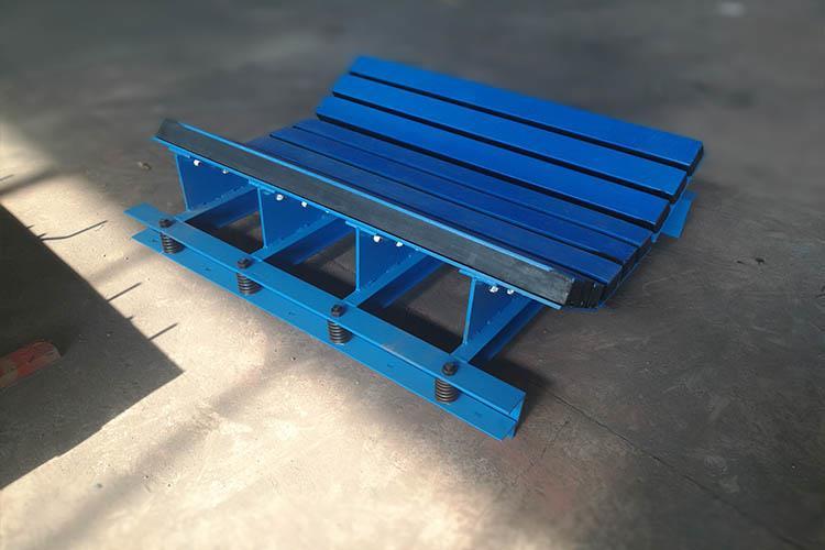 緩沖床的橡膠采用進口天然橡膠、橡膠彈性高、含膠量大、橡膠密實度高、抗拉強度大、能大程度上吸收下落物料的沖擊力,可有效的避免物料下落時對輸送帶的沖擊。緩沖床床體表面采用高耐磨分子材料,分子量大于650萬,光滑表面,摩擦系數小,耐磨性好,使得輸送帶運行時的摩擦力降到很低,廣泛用于礦山開采,礦井下巨型煤塊輸送。